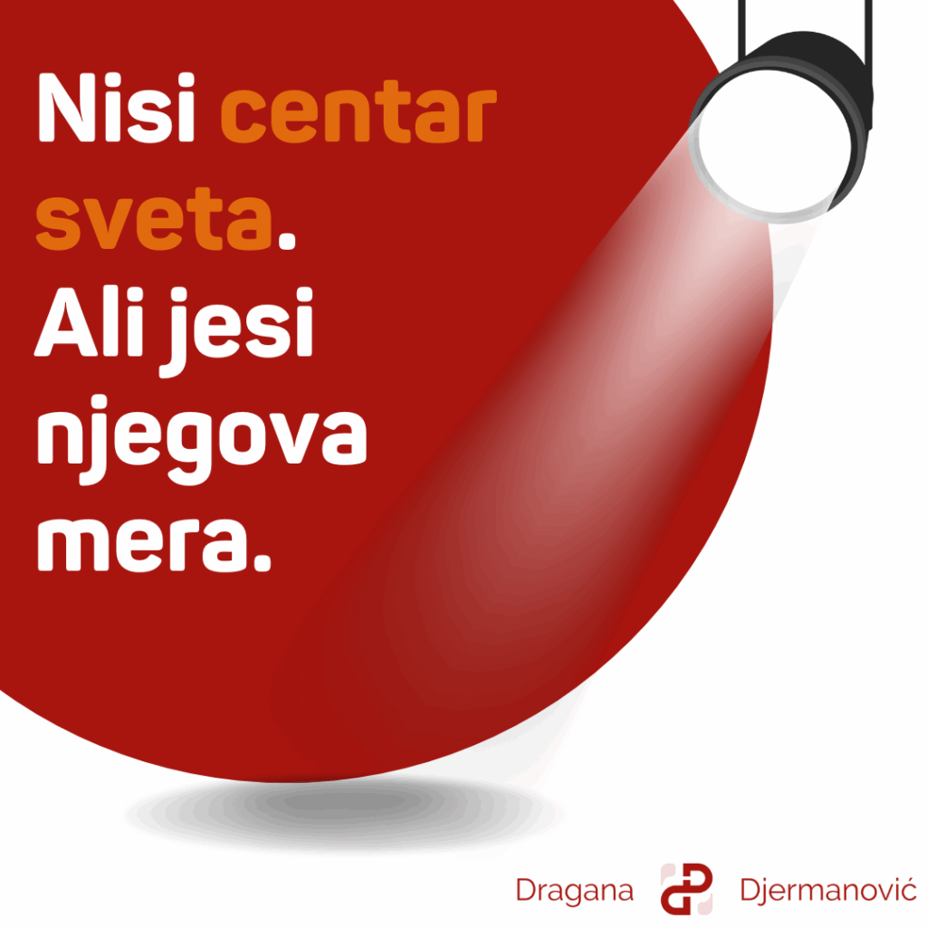 Nisi centar sveta – što je oslobađajuće. Jesi mera sveta – što je privilegija i odgovornost. U ovom delikatnom balansu leži tajna zdravog odnosa sa sobom i drugima. Ne pretpostavljaj da stalno misle na tebe, uz svesnost da ono što doživljavaš uvek prolazi kroz tvoj lični filter.