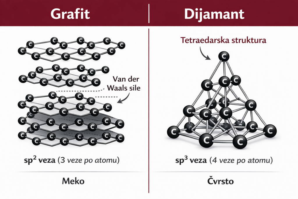 U dijamantu, svaki atom koristi sva četiri valentna elektrona za čvrste kovalentne veze sa četiri susedna atoma. Nema neangažovanih resursa. Svaka ruka drži drugu ruku. Svaki delić koji vredi je uložen. U grafitu, svaki atom koristi samo tri. Četvrti elektron ostaje neuložen i luta između slojeva, ni u jednoj vezi, ni u jednoj ulozi. I upravo taj jedan neuloženi elektron po atomu čini celu strukturu slabom.